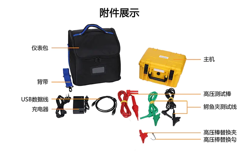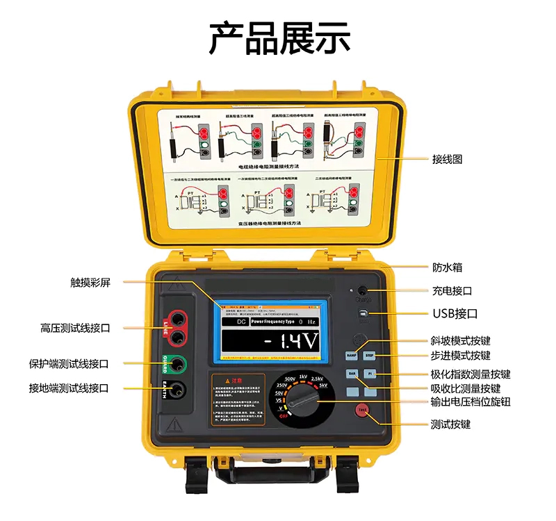 1.5寸觸摸彩屏,測(cè)試數(shù)據(jù)同屏顯示。測(cè)試操作及查詢歷史記錄非常方便。 2.絕緣電阻量程:0.005MΩ~10TΩ。 3.輸出額定電壓zui多達(dá)7檔(50V,250V,500V,1kV,2.5kV,5kV,10kV)。 4.zui大短路電流:5mA。 5.輸出功率大,抗干擾能力強(qiáng),在分布電容較大的場(chǎng)景下(如長(zhǎng)電纜線),以及強(qiáng)電磁干擾環(huán)境下(如變電站),具有穩(wěn)定的測(cè)試能力。 6.完善的測(cè)量指標(biāo):絕緣電阻(IR)、極化指數(shù)(PI)、吸收比(DAR)、步進(jìn)(STEP)、斜坡(RAMP)、交直流電壓(V)。 7.自設(shè)置測(cè)量模式,可選擇PI、DAR計(jì)算公式,為用戶提供多種選擇。 8.自設(shè)電壓模式:可自由設(shè)定測(cè)試電壓及測(cè)試時(shí)長(zhǎng),方便特殊場(chǎng)景需要。 9.電壓監(jiān)視器:自動(dòng)監(jiān)測(cè)被測(cè)物帶電電壓。電壓超過(guò)36V自動(dòng)禁止測(cè)試有效保護(hù)儀表和操作人員。 10.自動(dòng)放電功能,測(cè)試后自動(dòng)快速釋放被測(cè)物的充電電荷,無(wú)需外加放電回路。 11.大容量充電鋰電池組14.8V 5200mAh。以保障長(zhǎng)時(shí)間測(cè)試工作。 12.大容量測(cè)試記錄存儲(chǔ)器,測(cè)試記錄可在本儀器直接瀏覽分析??勺詣?dòng)存儲(chǔ)具有測(cè)試日期、測(cè)試計(jì)時(shí)的實(shí)時(shí)測(cè)試數(shù)據(jù)共1000組。 13.USB通信上傳功能,記錄數(shù)據(jù)可上傳電腦進(jìn)行存儲(chǔ)數(shù)據(jù)統(tǒng)計(jì)分析。 14.藍(lán)牙通信功能,可將測(cè)試結(jié)果上傳到手機(jī)。 15.雙層外殼結(jié)構(gòu),堅(jiān)固耐用,防護(hù)等級(jí)IP65。